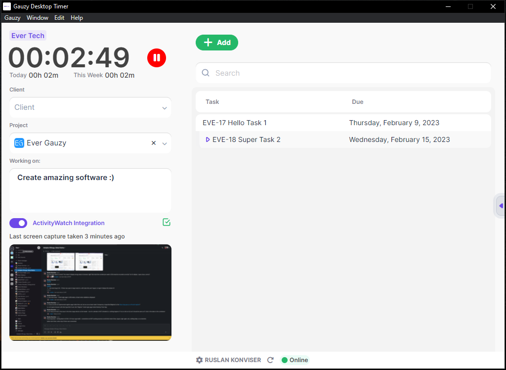 Ever® Gauzy™ Desktop Timer App - allows running Time and Activity Tracking for employees/contractors with screenshots and activity monitoring. It is recommended to setup by organization employees as long as they are not interested in other Gauzy Platform features (e.g. accounting) and only need to track work time.